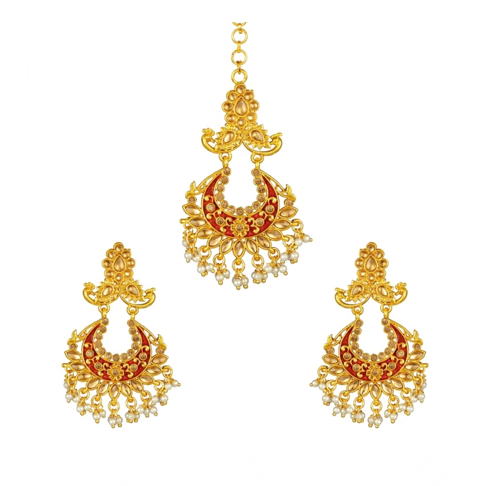 BS Women’s Rose Gold Plated Alloy Kundan Earrings & Mangtikka (Maroon)