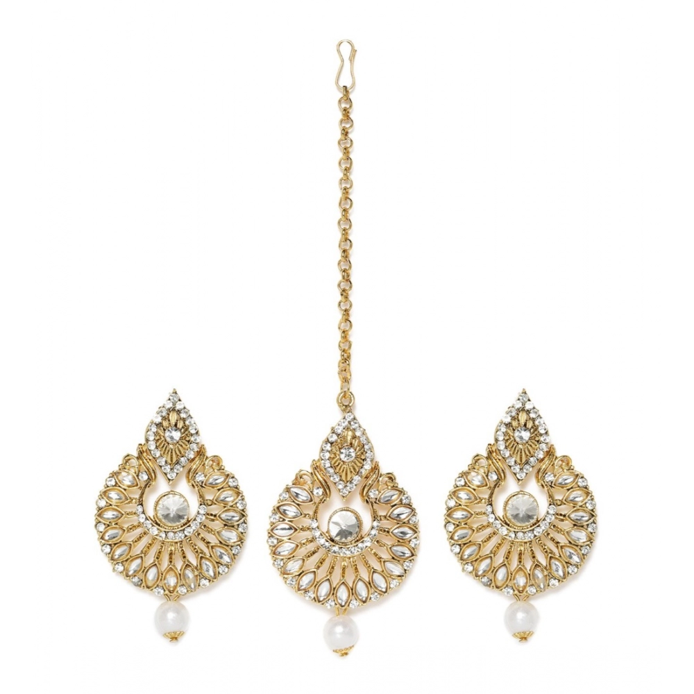 BS Women’s Rose Gold Plated Alloy Kundan Earrings & Mangtikka (White)
