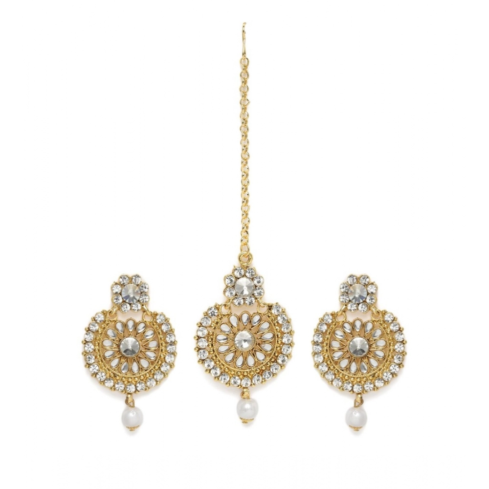 BS Women’s Rose Gold Plated Alloy Kundan Earrings & Mangtikka (White)